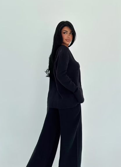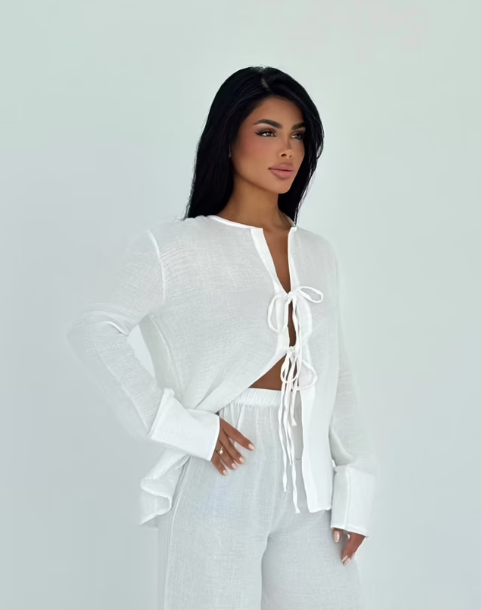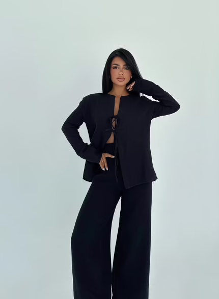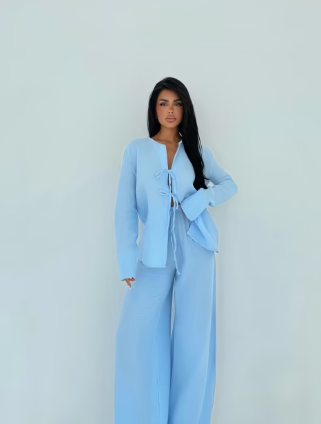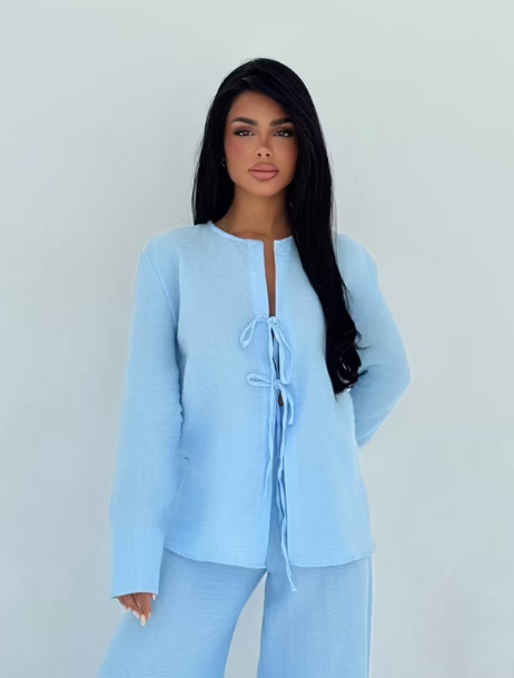 Das Oberteil mit zarten Bindungen auf der Vorderseite sorgt für einen femininen Akzent, während die weit geschnittene Hose für ein fließendes, angenehmes Tragegefühl steht.