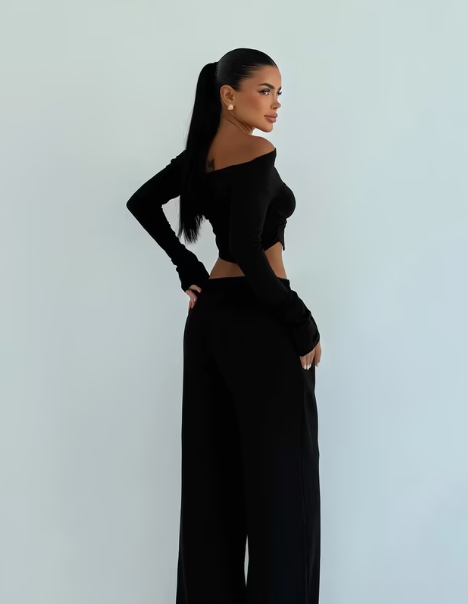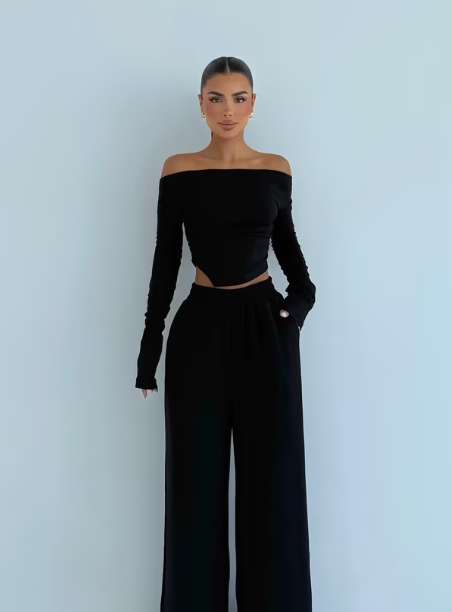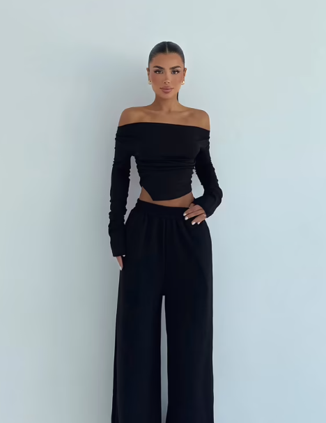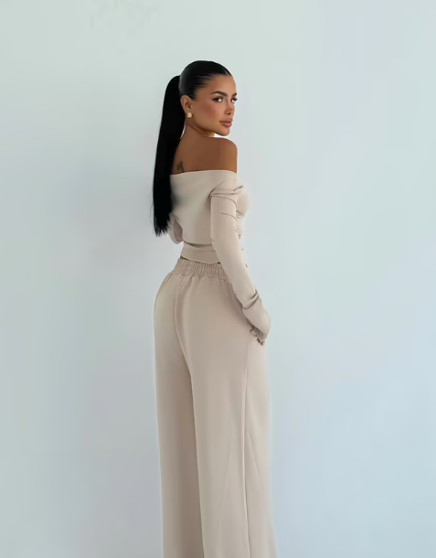 Das Off-Shoulder-Top mit langen Ärmeln umspielt sanft die Schultern und betont die Taille, während die weit geschnittene Hose Leichtigkeit und Bewegungsfreiheit bietet.