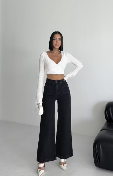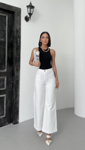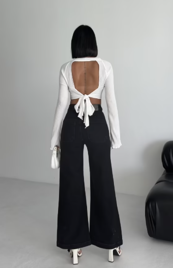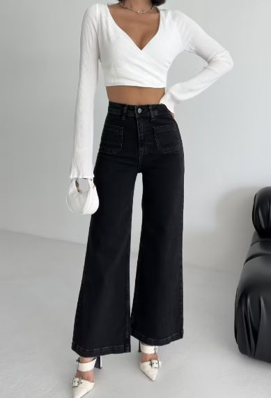 Der hohe Bund und das weit geschnittene Bein schaffen eine moderne, elegante Form, die sich sowohl mit Croptops als auch mit Blazern mühelos kombinieren lässt.