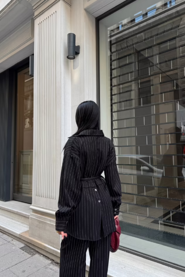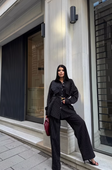 Das feine Nadelstreifenmuster verleiht dem Look eine subtile Struktur, während der fließende Stoff und die leicht übergroße Passform einen modernen, luxuriösen Eindruck schaffen.